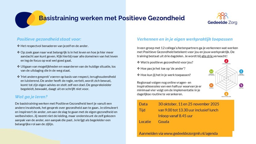 In een groep met 12 collega’s/ ketenpartners ga je verkennen wat werken met Positieve Gezondheid betekent voor jou en jouw werkpraktijk. De training bestaat uit drie dagdelen. Je wordt bij alle drie verwacht!