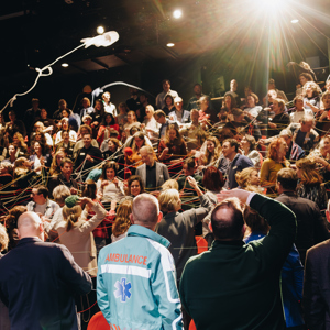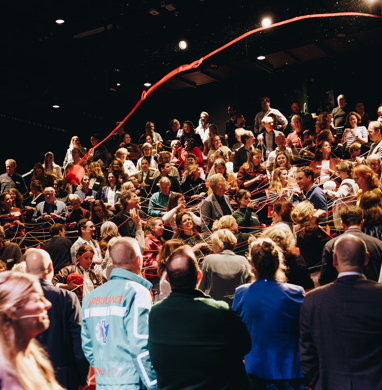 Bij terugkomst in de zaal voor het laatste stukje centraal programma, bouwden we een klein feestje. Met hulp van AI en de mensen in de zaal produceerden we de aanstekelijke veranderhit ‘Wij doen het’.