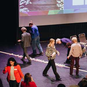 Vervolgens was het tijd om wat collega’s uit de regio op het podium te halen en hun eigen veranderverhalen te laten delen. Zoals Berthie, over wat Positieve Gezondheid kan betekenen voor mensen en dat bestuurders hierin het voortouw kunnen nemen. En Guy, die vertelde dat bewoners van Zorgpartners tegen de verwachting in blij waren dat ze zelf verantwoordelijk werden gemaakt voor hun medicijninname, want: geen verzorgende die om 8.00 uur aan je deur klopt, maar eindelijk uitslapen! En Steven, die dankzij betere digitale gegevensuitwisseling de spoedeisende hulp al volledig vanuit zijn ambulance kan briefen over de patiënt in aantocht.